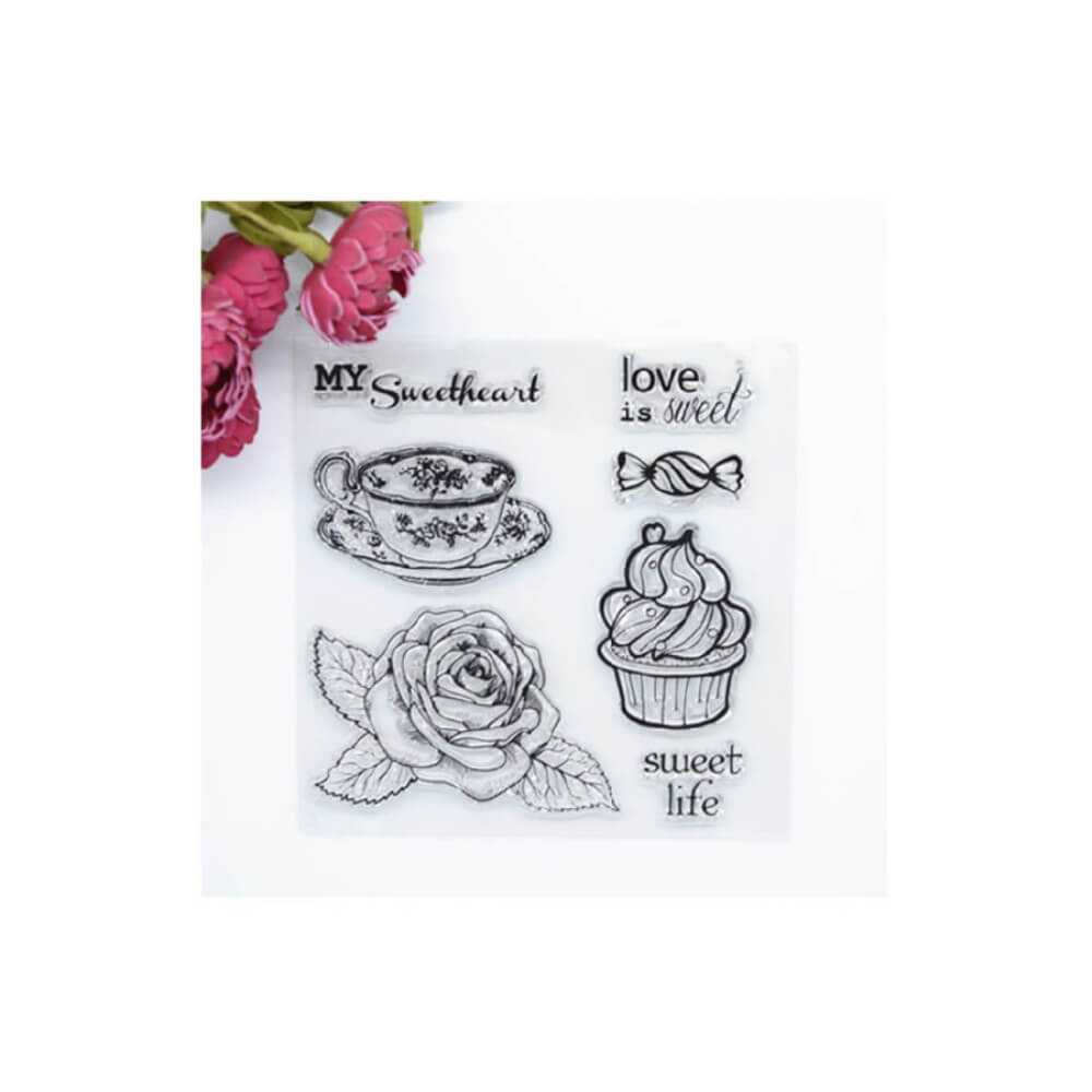 Cup cake, tea and rose clear stamp for scrapbooking. These are outline stamps and can be stamped and colored to your choice.