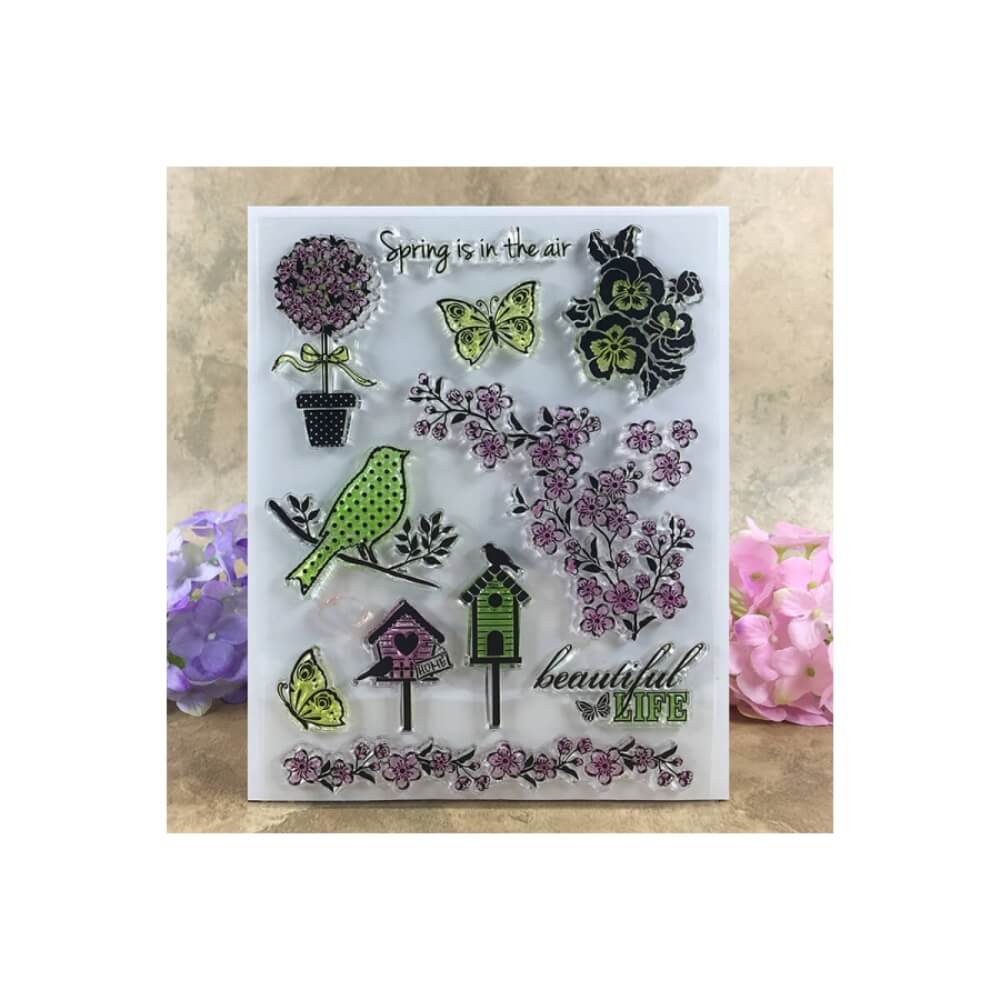 Spring bird, bird house and cluster flower clear stamp. This is an outline stamp which you can stamp and color to your choice for card making or scrapbooking